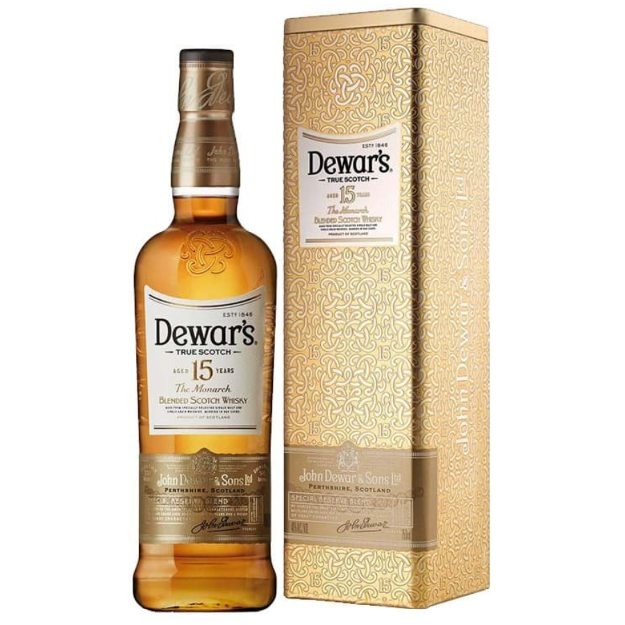 Chai Dewar’s 15 Năm mang phong cách cổ điển pha hiện đại, với nhãn vàng đồng ánh kim sang trọng – biểu tượng cho độ tuổi trưởng thành và đẳng cấp của whisky bên trong. Dòng chữ “15 Years Old – The Monarch” nổi bật giữa thân chai, khẳng định vị thế đặc biệt trong bộ sưu tập Dewar’s.