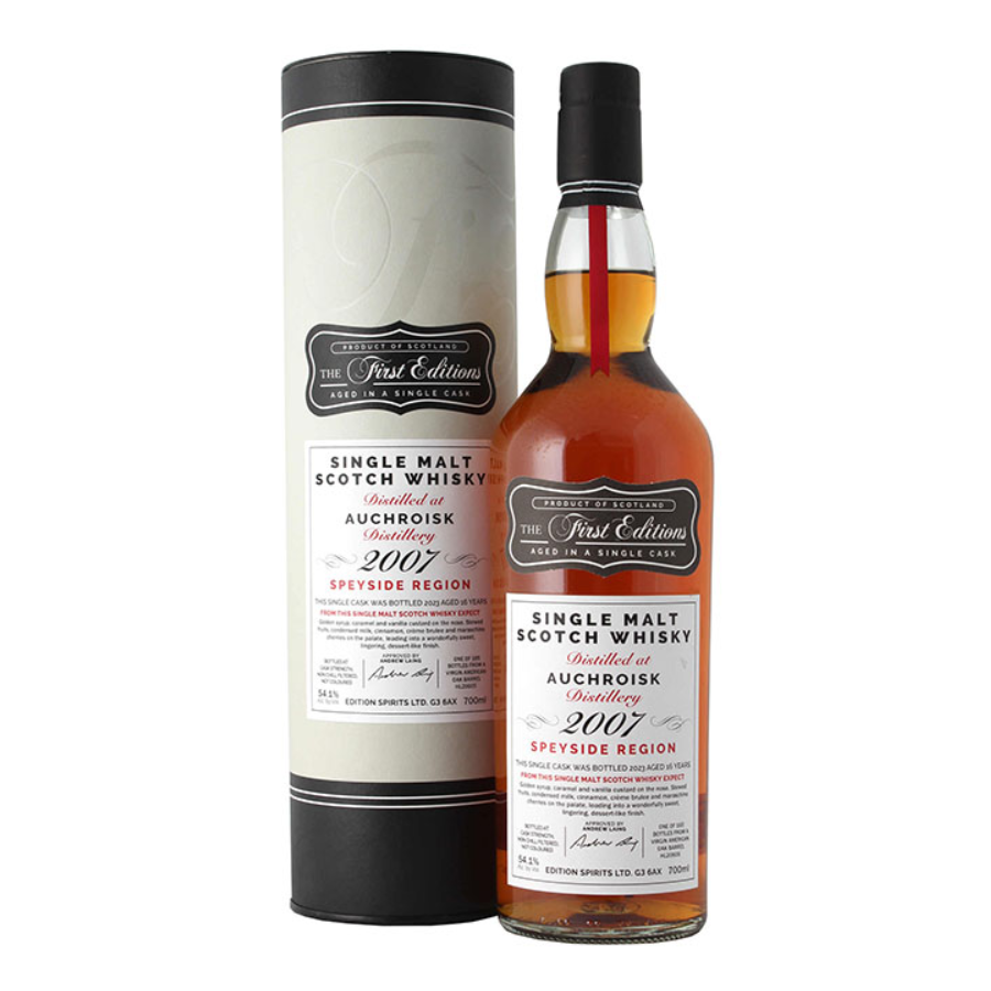First Editions Auchroisk 2007 là single cask Speyside single malt whisky được tuyển chọn và đóng chai bởi nhà độc lập danh tiếng Hunter Laing & Co. – thương hiệu nổi tiếng với dòng The First Editions, chuyên giới thiệu những thùng rượu độc bản, chất lượng cao và không pha trộn. Phiên bản này được chưng cất tại Auchroisk Distillery năm 2007, ủ trong thùng sherry hogshead, sau đó được đóng chai không lọc lạnh (non-chill filtered) và không thêm màu, giữ trọn hương vị nguyên bản từ thùng gỗ.