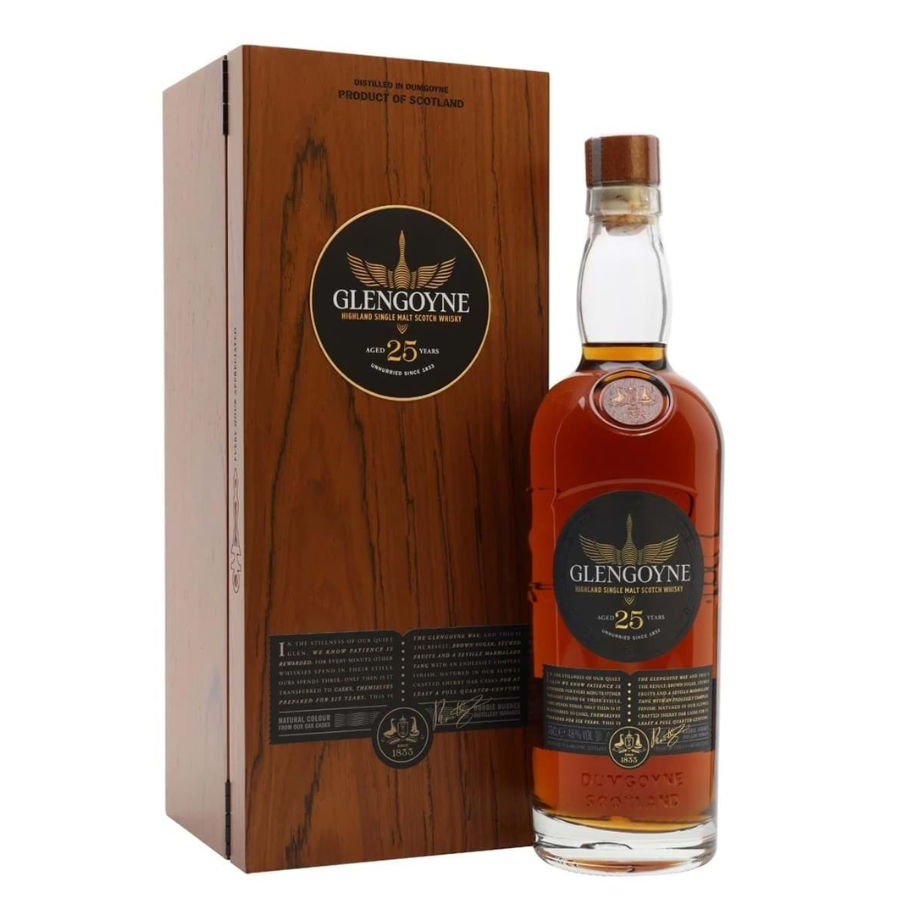 Được đóng chai ở nồng độ 48%, không lọc lạnh và không pha màu, Glengoyne 25 Years Old giữ nguyên hương vị tự nhiên, mượt mà và dày vị của whisky sherry lâu năm. Đây không chỉ là một chai whisky thượng hạng dành cho người sành rượu, mà còn là biểu tượng của thời gian và sự kiên định trong nghệ thuật ủ rượu, đồng thời là món quà biếu xa xỉ và đẳng cấp cho những dịp đặc biệt.