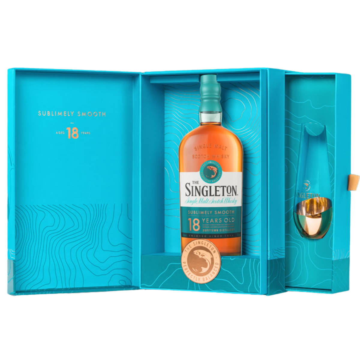 Hộp quà năm nay sử dụng tông xanh ngọc, tượng trưng cho:Sự tươi mới.May mắn đầu xuân . Dòng chảy liên tục của thời gian – điều rất phù hợp với whisky lâu năm.Họa tiết cá hồi Singleton và đường vân mô phỏng dòng nước Speyside thể hiện triết lý: “Whisky ngon phải bắt đầu từ nguồn nước tốt.”Bộ quà còn đi kèm ly tặng kèm giúp nâng hương, phù hợp khi thưởng thức single malt 18 năm tuổi.